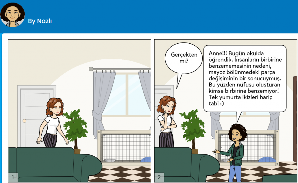 7. sınıf öğrencilerimiz Fen Bilimleri derslerinde öğrendikleri mitoz ve mayoz bölünme konularını, Bilişim Teknolojileri dersinde gördükleri uygulamalarla birleştirerek harika bir karikatür çalışması gerçekleştirdiler. Eğlenceli olduğu kadar, disiplinler arası geçiş yöntemiyle de ilgi çeken çalışmada öğrenciler, kendi avatarlarını oluşturarak mitoz ve mayoz bölünme ile bu seneki 7. sınıflar tema konumuz olan nüfusa vurgu yaparak yaratıcılıklarını konuşturdular.