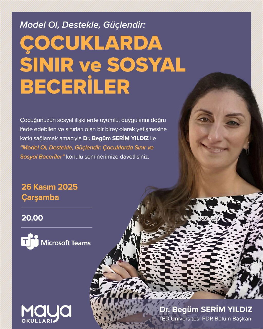 26 Kasım 2025 Çarşamba akşamı Microsoft Teams üzerinden gerçekleştirilen “Model Ol, Destekle, Güçlendir: Çocuklarda Sınır ve Sosyal Beceriler” seminerimiz, velilerimizin sıcak katılımıyla gerçekleşti.