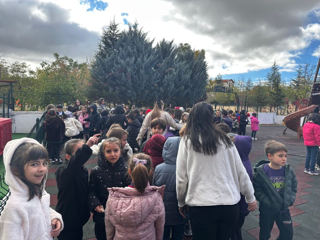 Tatbikat sırasında öğrenciler, öğretmenlerinin yönlendirmesiyle “Çök – Kapan – Tutun” uygulamasını yaparak güvenli alanlarda kendilerini koruma pratiklerini deneyimlediler. Ardından okul binasını düzenli ve sakin bir şekilde tahliye ederek toplanma alanında bir araya geldiler.