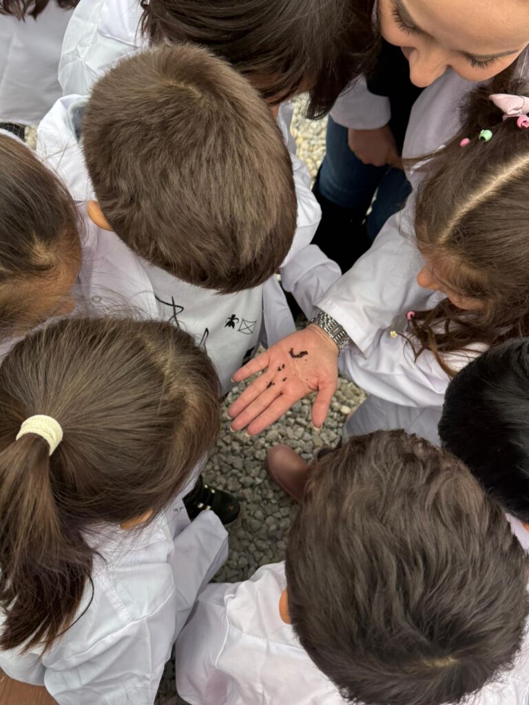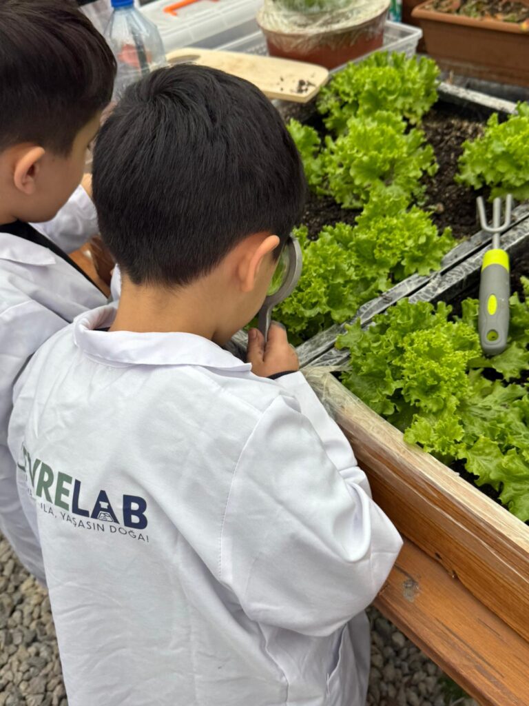 Geleceğin doğa koruyucuları, kendileri için özel hazırlanan çevre laboratuvarı önlüklerini giyerek işe koyuldular. Önce hayallerindeki renkleri saksılarına yansıtan çocuklar, ardından okulumuzun Çevre Laboratuvarı’nı keşfe çıktılar. Laboratuvar ortamında doğanın işleyişine dair merak dolu gözlerle bilgi alan minikler, ekosistemi korumanın önemini yerinde gözlemlediler.