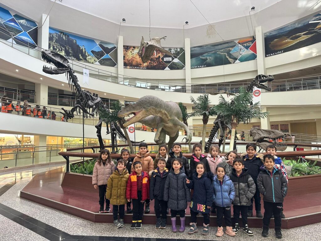 Müze kapısından girdikleri andan itibaren karşılaştıkları dev dinozor iskeletleri, fosiller ve nesli tükenmiş canlı canlandırmalarıyla heyecan dolu anlar yaşayan öğrencilerimiz, dünyamızın oluşum sürecine dair bilgilerini yerinde gözlemleyerek pekiştirdiler. Milyonlarca yıl önce yaşamış dev canlıların izini süren minikler, adeta bir zaman tünelinde yolculuk yaptılar.