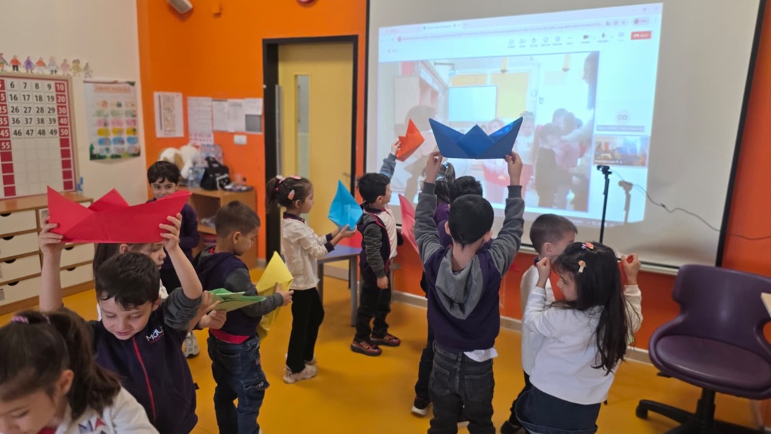 Oran Maya Ana sınıfı öğrencileri birbirlerini ve kültürlerini tanımak için Yunanistan, Drama 16’daki arkadaşlarıyla online olarak bağlantı kurdu. Öğrencilerimiz Türkiye’ye özgü unsurları ve Ankara’yı tanıttıktan sonra, Drama 16’daki arkadaşlarıyla birlikte origami ile kağıttan bot yapmayı öğrendiler.